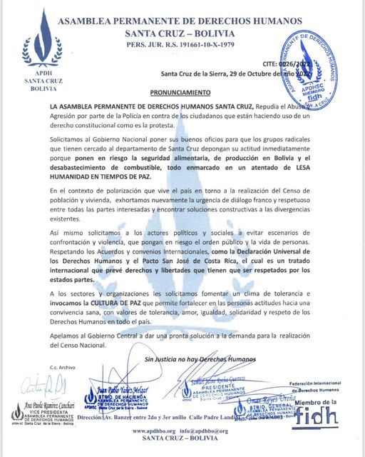 Asamblea de DDHH – Santa Cruz repudia abuso y agresión de la Policía contra ciudadanos que protestan en Santa Cruz así mismo señalan que el Cerco del Gobierno del MAS es un atentado de Lesa Humanidad en Tiempos de Paz.