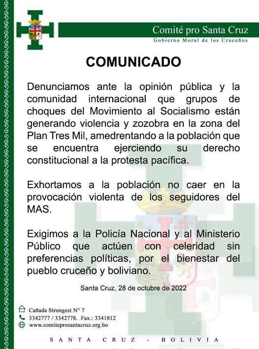 Comité cruceño denuncia que grupos de choques del MAS están genando violencia en el Plan 3000