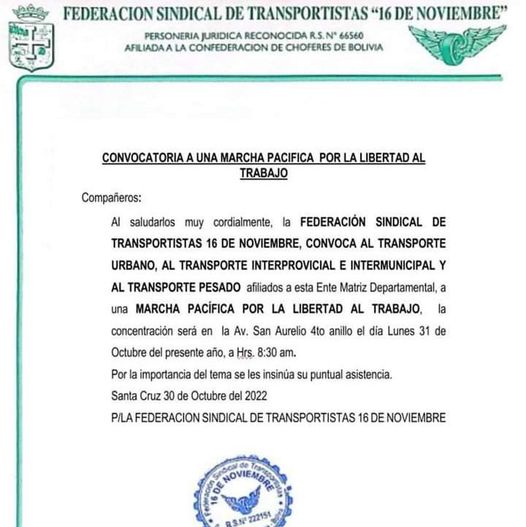 Información que llega a #ElBunker es que mañana la Convocatoria de la Federación Sindical de Transportistas 16 de Noviembre en su “Marcha Pacifica” estaría en su planes tomar la Gobernación de Santa Cruz… Ampliaremos… #Censo2023
