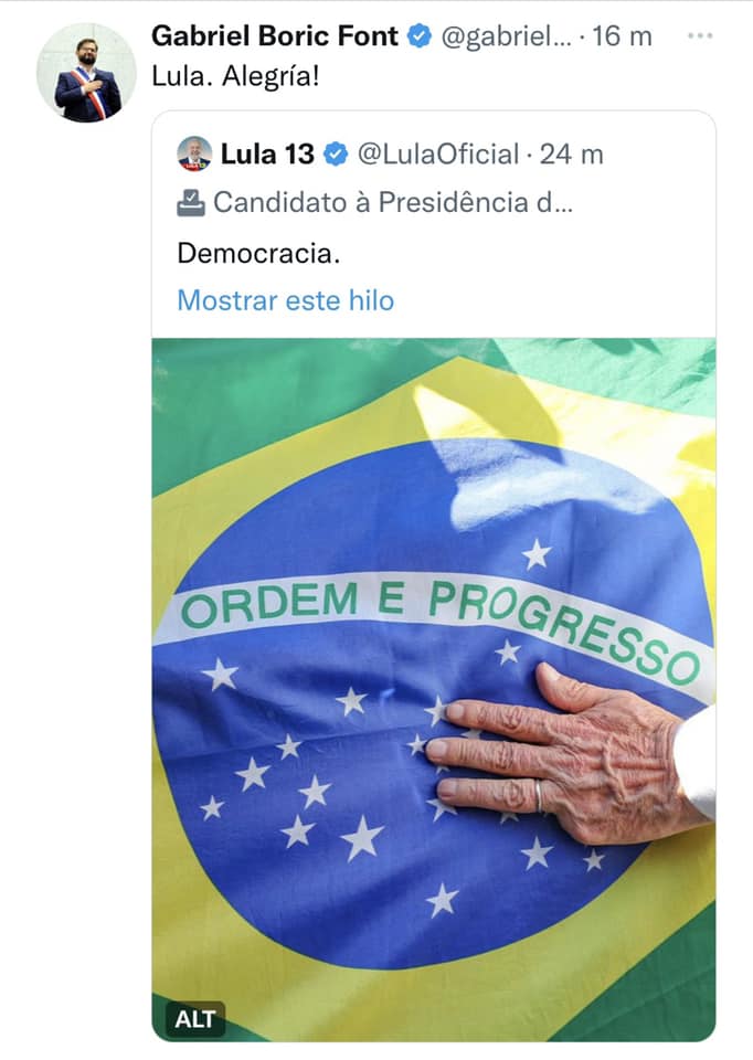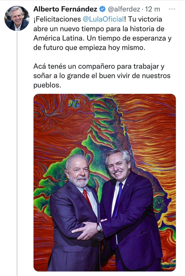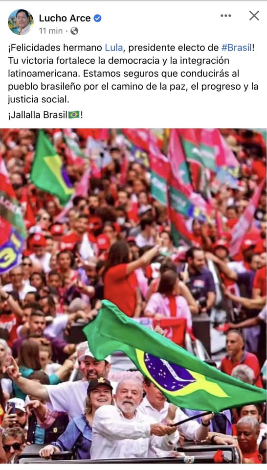Presidente de Bolivia, Luis Arce y otros mandatarios y líderes de la región saludan el triunfo de Lula da Silva en la segunda vuelta presidencial en Brasil