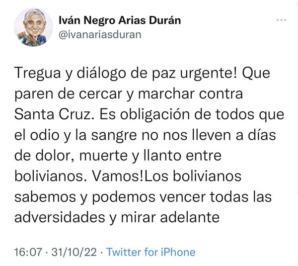Alcalde de #LaPaz pide tregua y diálogo de paz urgente!!! Que pare el cerco y marcha contra #SantaCruz