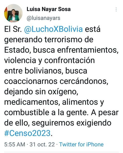 Diputada de #CC le dice al presidente Arce que aún cercada #SantaCruz seguirá firme con el #Censo2023