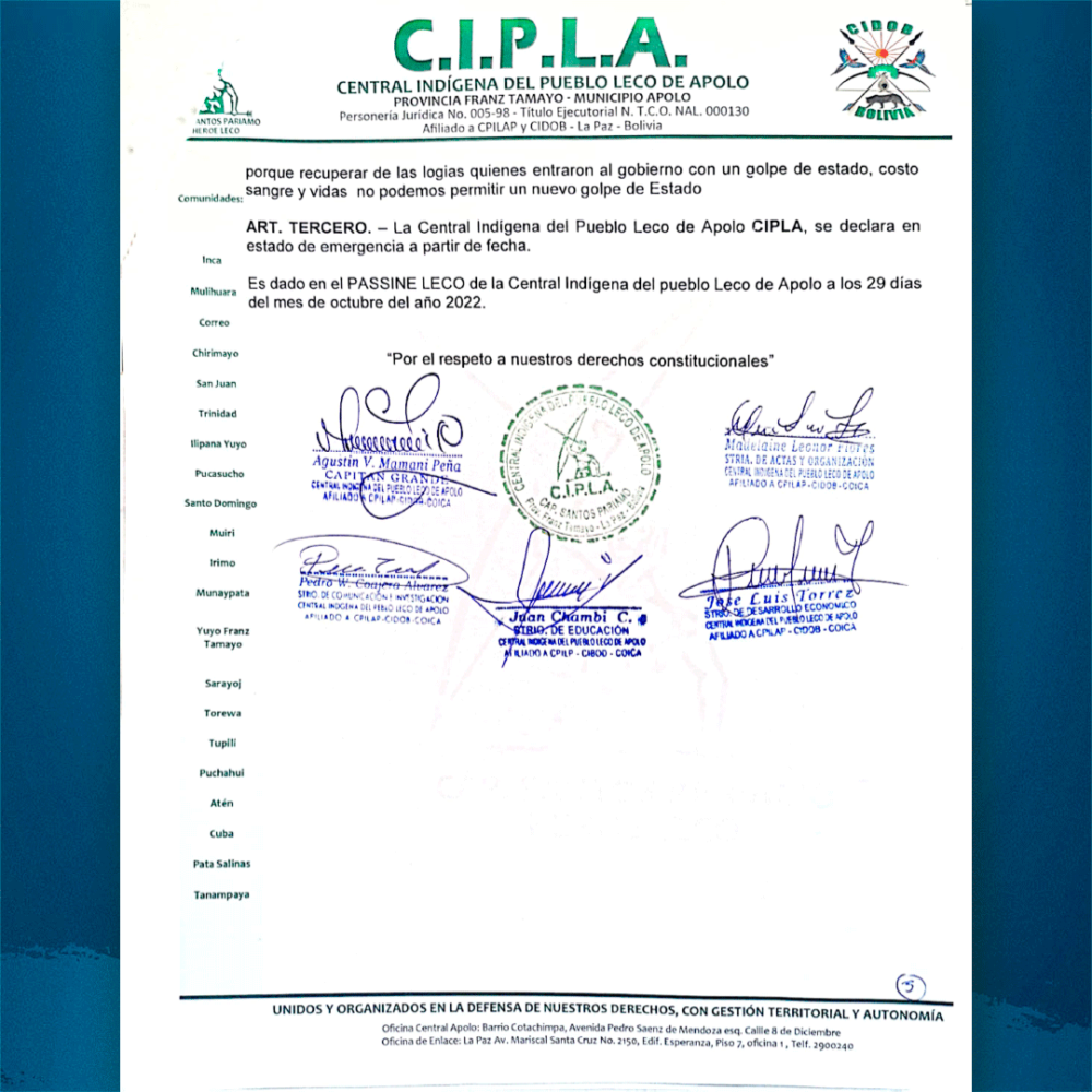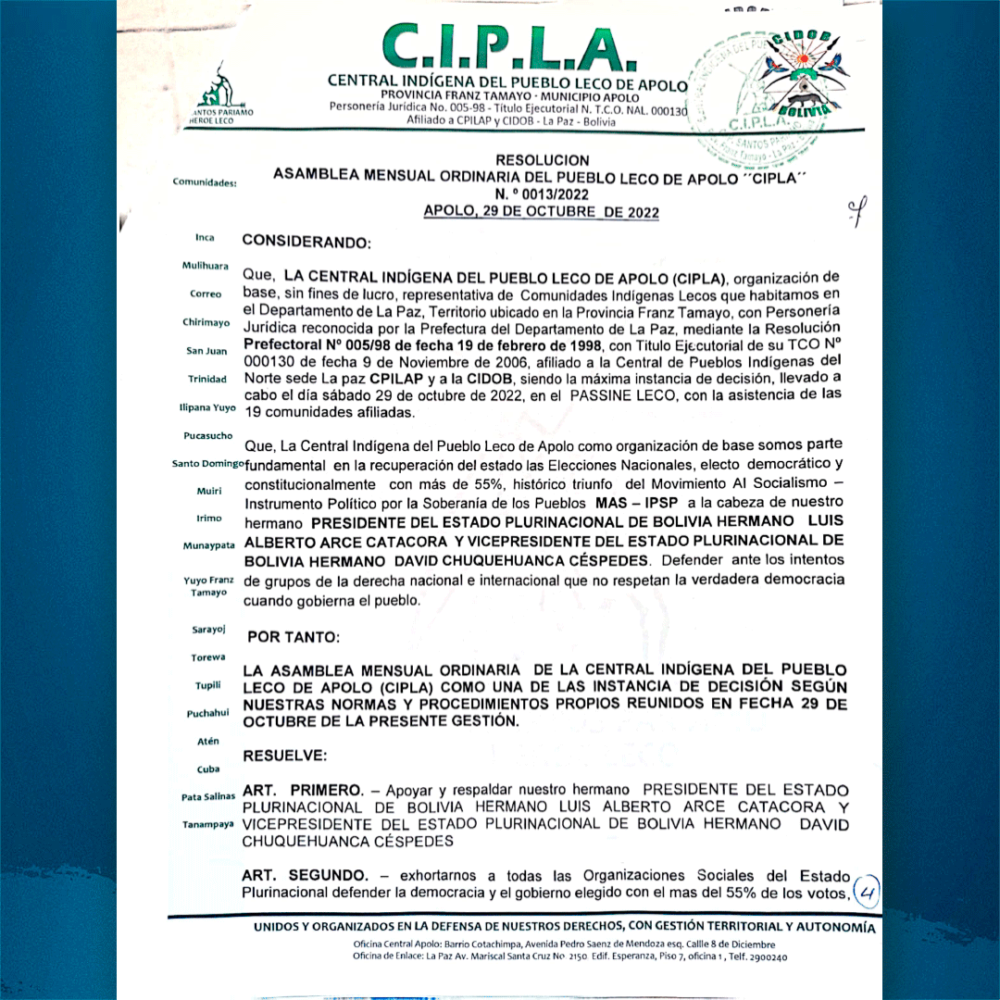 Esta es la unidad que nos fortalece y nos da la certeza que nuestra Revolución Democrática y Cultural no para. Agradecemos el respaldo de nuestra Asamblea Mensual Ordinaria de la Central Indígena del Pueblo Leco de Apolo – CIPLA. https://t.co/UOJs55TnD7