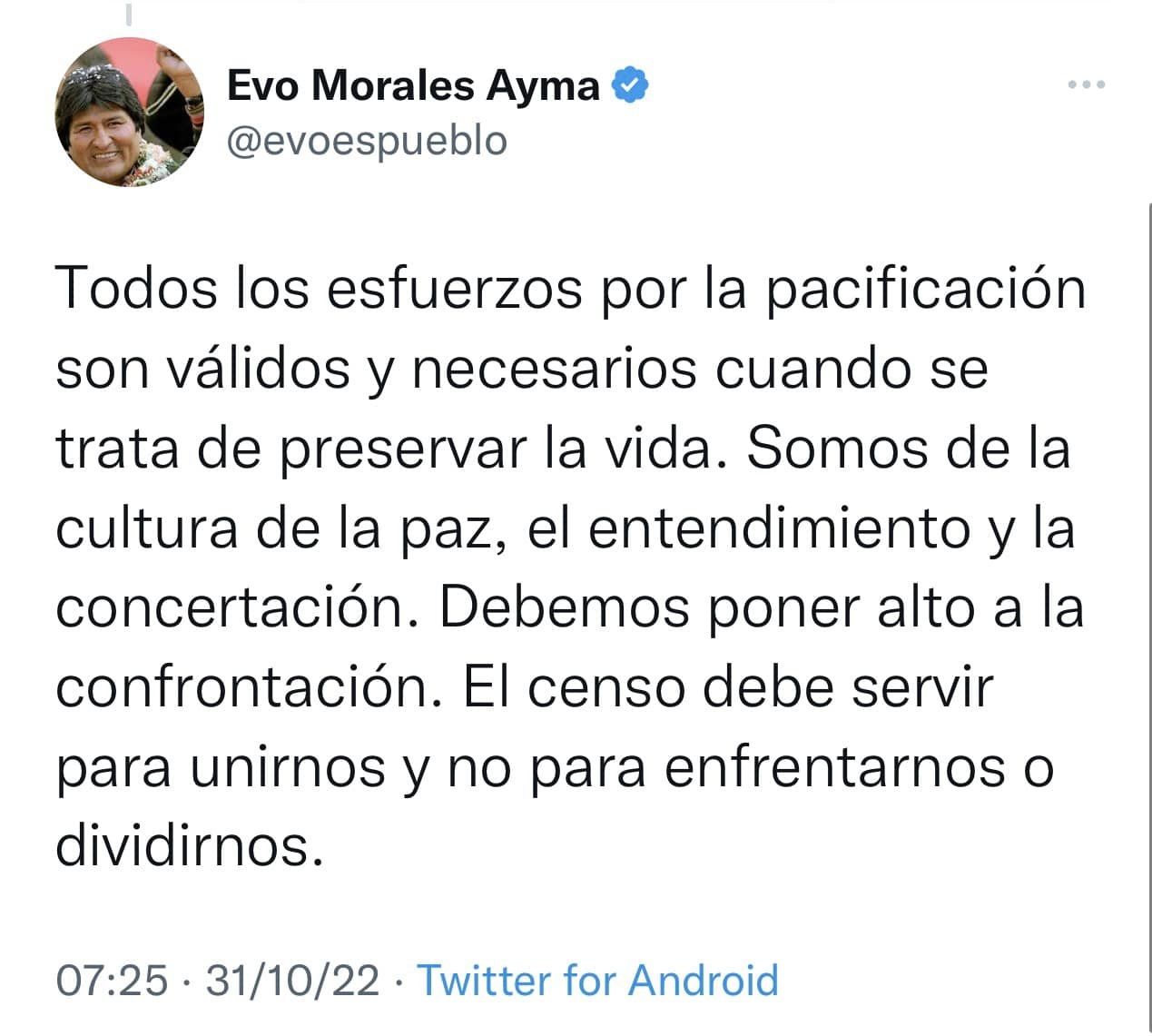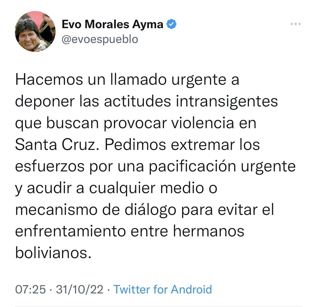 Evo Morales hace un “llamado urgente” a deponer “actitudes intransigentes” que buscan provocar violencia en #SantaCruz