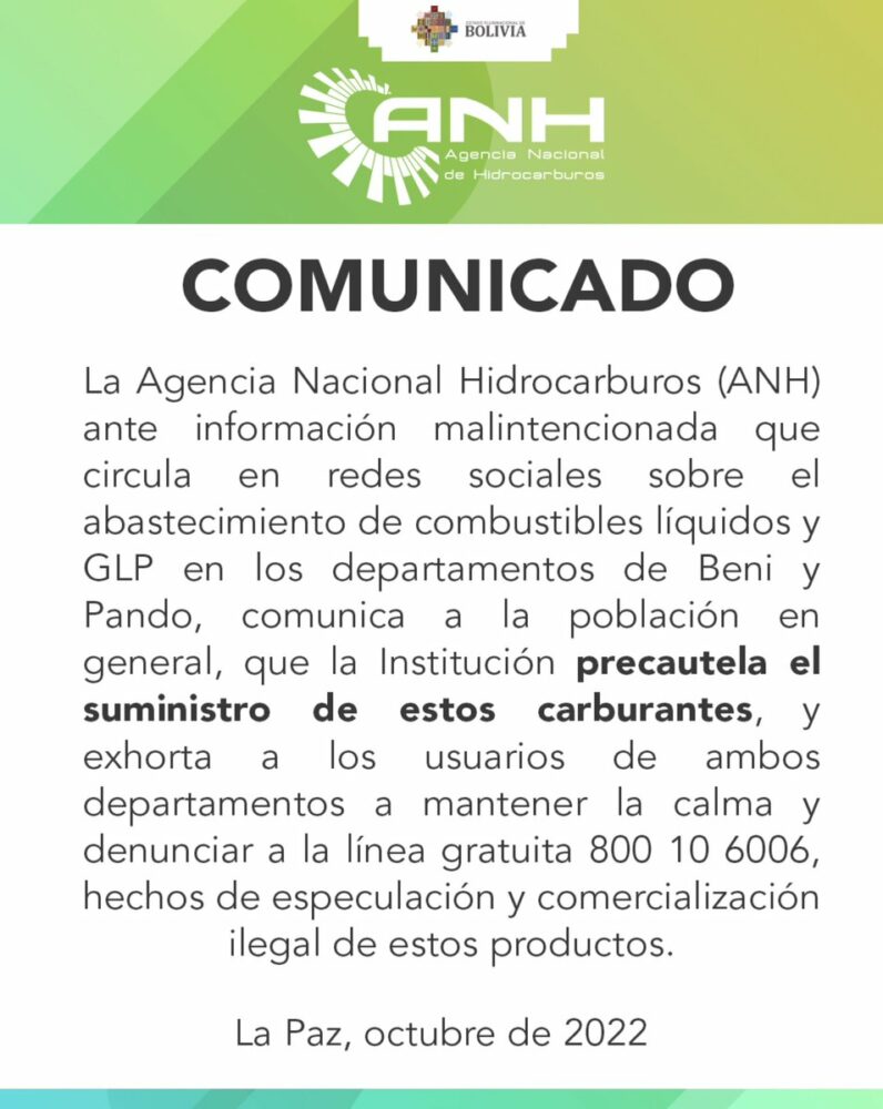 🔵#ANF I La @AnhBolivia aclara que, ante rumores sobre un supuesto desabastecimiento de carburantes en #Beni y #Pando, «precautela el suministro de estos carburantes y exhorta a los usuarios a mantener la calma y denunciar hechos de especulación». https://t.co/DlPkjBncsk
