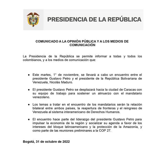 RKC#ÚLTIMO# Gustavo Petro viajará este martes a Caracas para reunirse con Nicolás MaduroCategorías NoticiasEtiquetas , Facebook, Kawsachun Coca 31/10/2022 RKC#ÚLTIMO#❗️Gustavo Petro viajará este martes a Caracas para reunirse con Nicolás Maduro Fuente: Kawsachun Coca