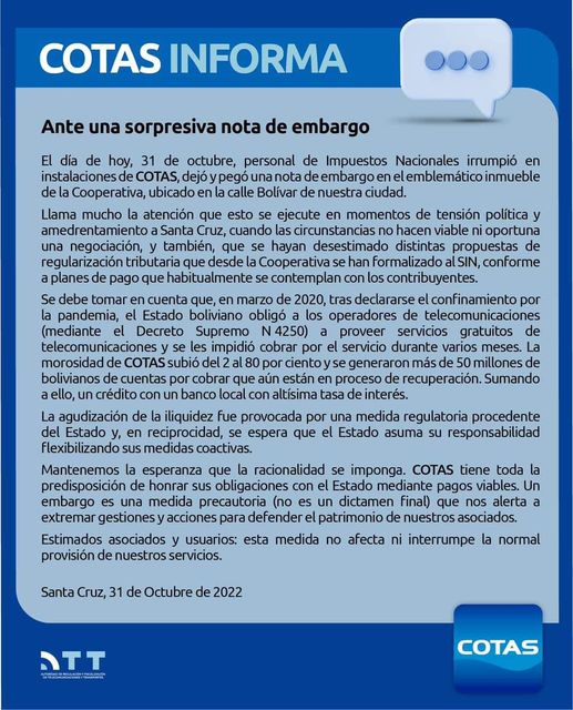 COTAS confirma embargo de oficinas en la Calle Bolivar por parte de Impuestos Nacionales y asegura en un comunicado que ‘llama la atención que se ejecute en momentos de tensión politica’.