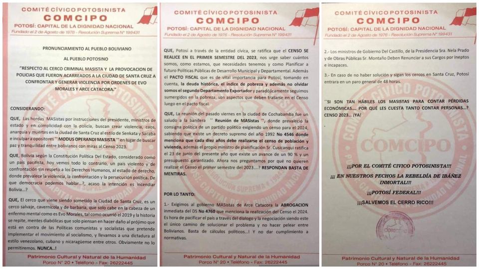El comité cívico Potosinista (COMCIPO) se pronuncia respecto a la violencia y cerco en Santa Cruz.