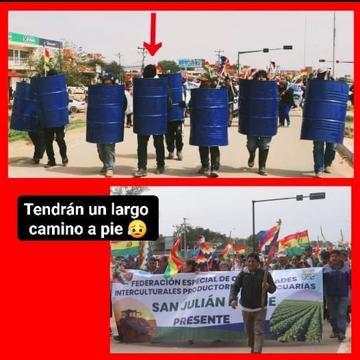 👀A la cabeza de un sujeto encapuchado y con escudos artesanales, las organizaciones sociales de San Julián emprendieron una marcha hacia la ciudad de Santa Cruz en demanda de que se levante el paro y que renuncie el gobernador.