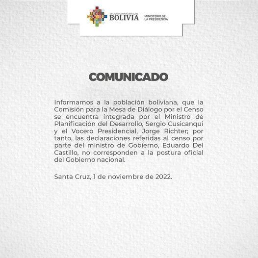 “Declaraciones referidas al censo por parte del Ministerio de Gobierno no corresponden a la postura oficial del Gobierno Nacional”