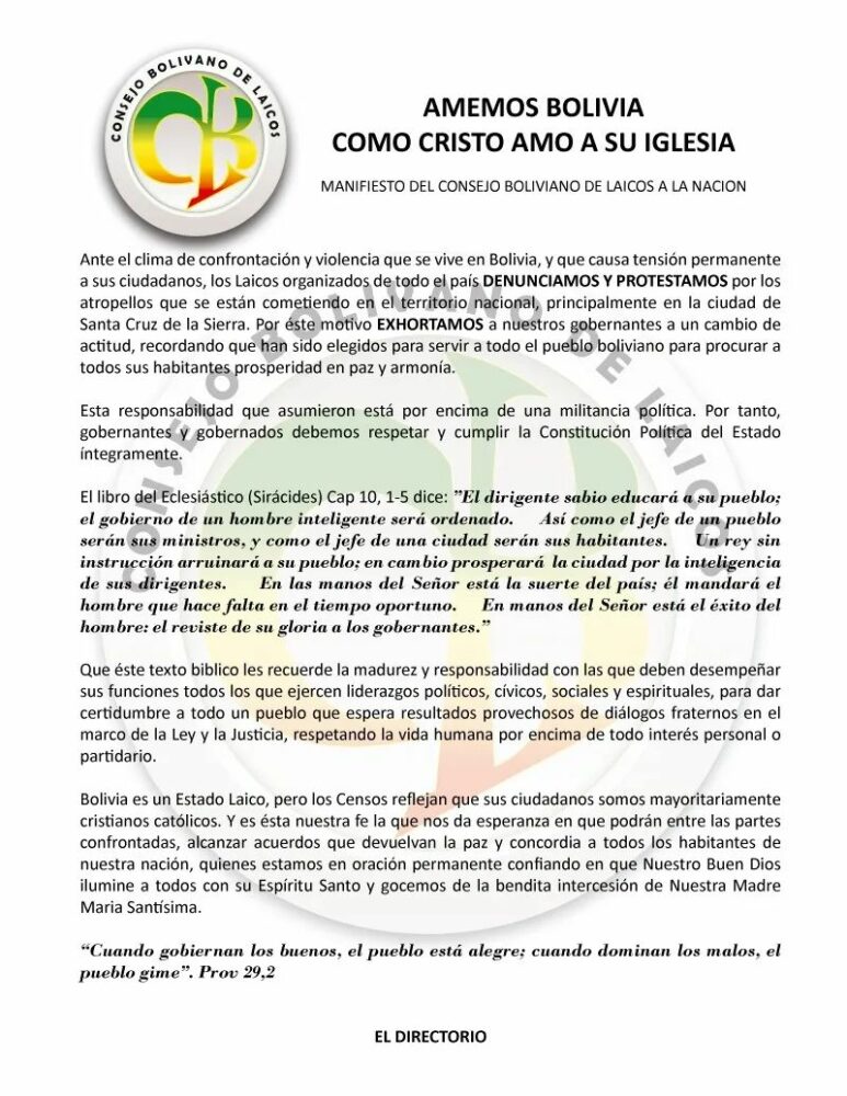 El Consejo Boliviano de Laicos emitió un manifiesto para denunciar y protestar por los atropellos que se están cometiendo en el territorio nacional pic.twitter.com/hyn4BnVAnK