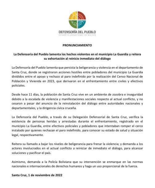 #LaPaz Defensor del pueblo lamenta violencia en La Guardia por Censo y exhorta reinicio del diálogo.