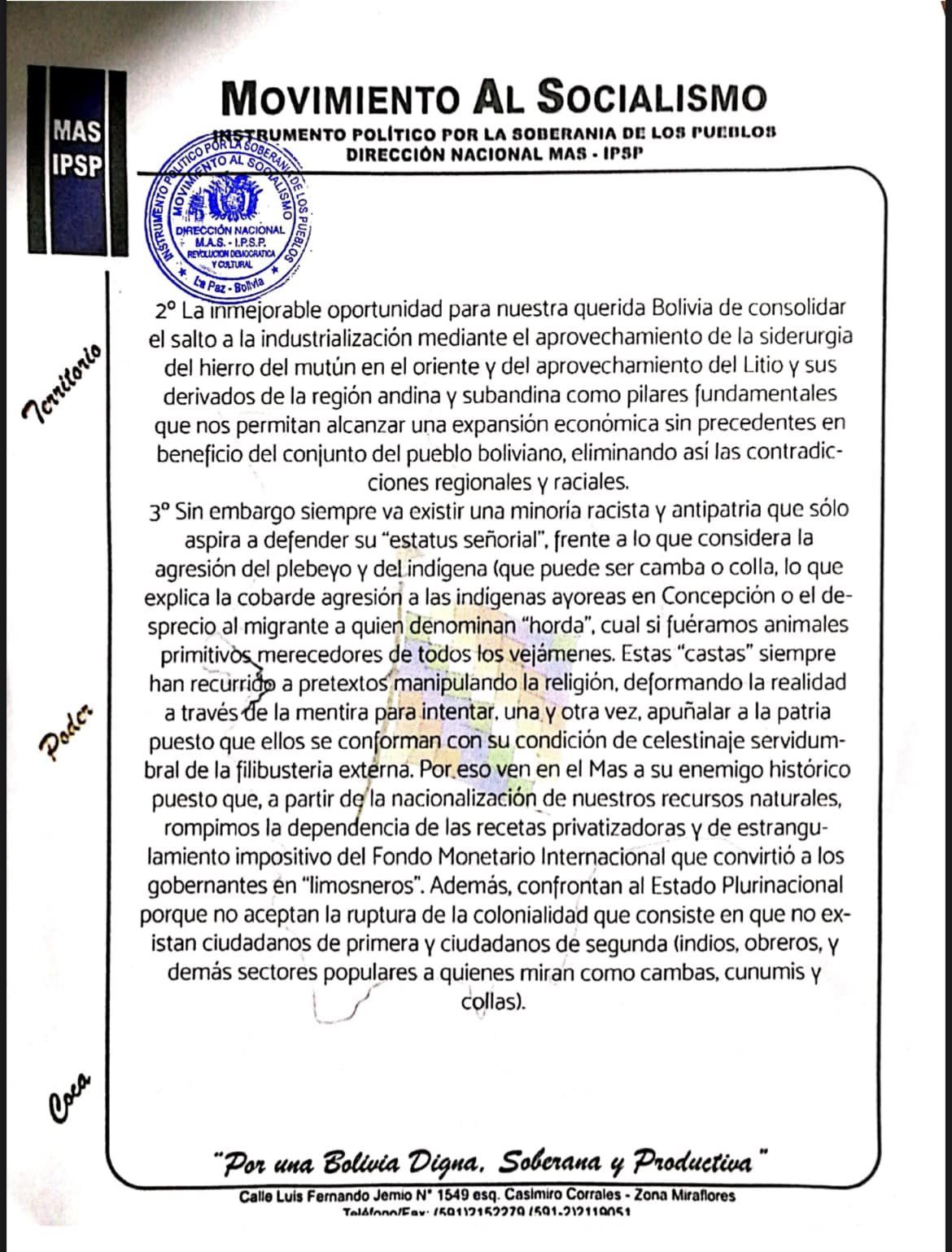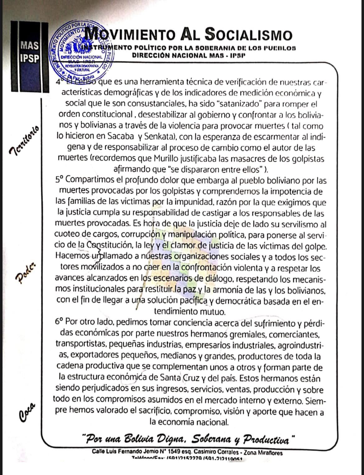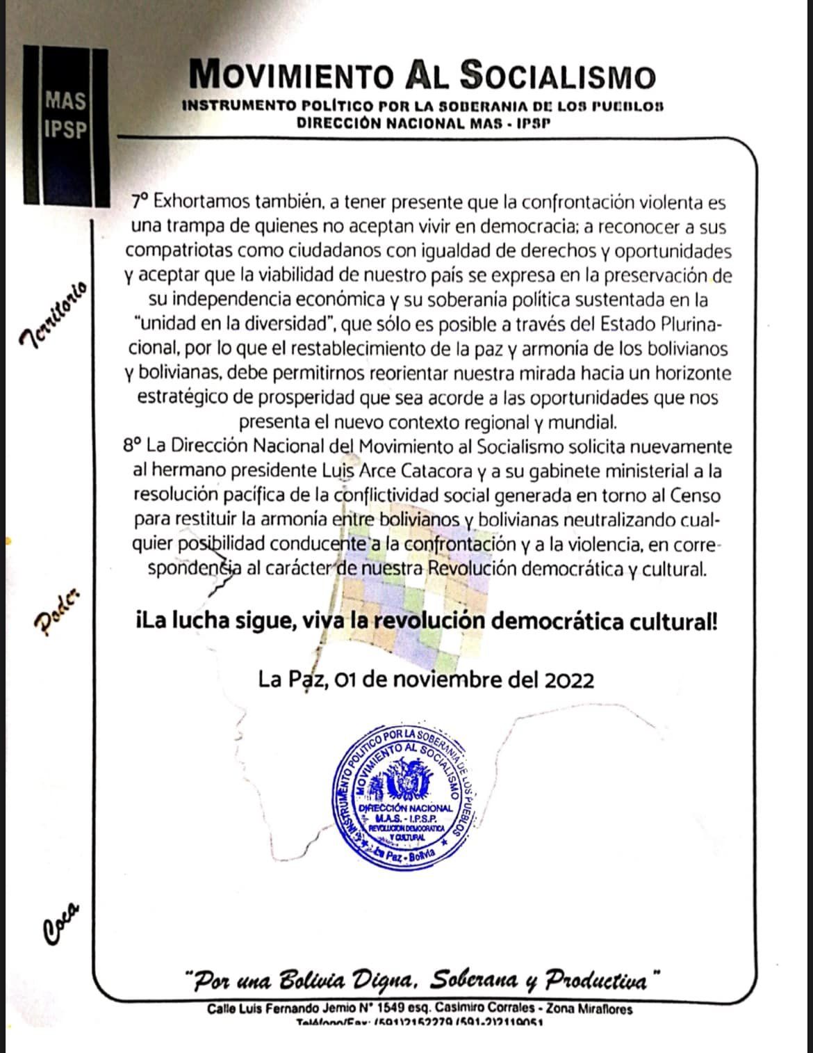 8º La Dirección Nacional del Movimiento al Socialismo solicita nuevamente al hermano presidente Luis Arce Catacora y a su gabinete ministerial a la resolución pacífica de la conflictividad social generada en torno al Censo para restituir la armonía entre bolivianos y bolivianas neutralizando cualquier posibilidad conducente a la confrontación y a la violencia, en correspondencia al carácter de nuestra Revolución democrática y cultural.