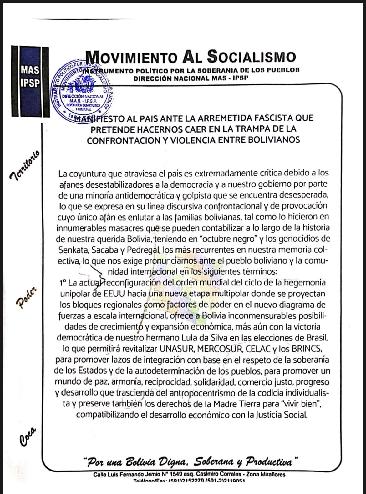 MANIFIESTO AL PAIS ANTE LA ARREMETIDA FASCISTA QUE PRETENDE HACERNOS CAER EN LA TRAMPA DE LA CONFRONTACION Y VIOLENCIA ENTRE BOLIVIANOS