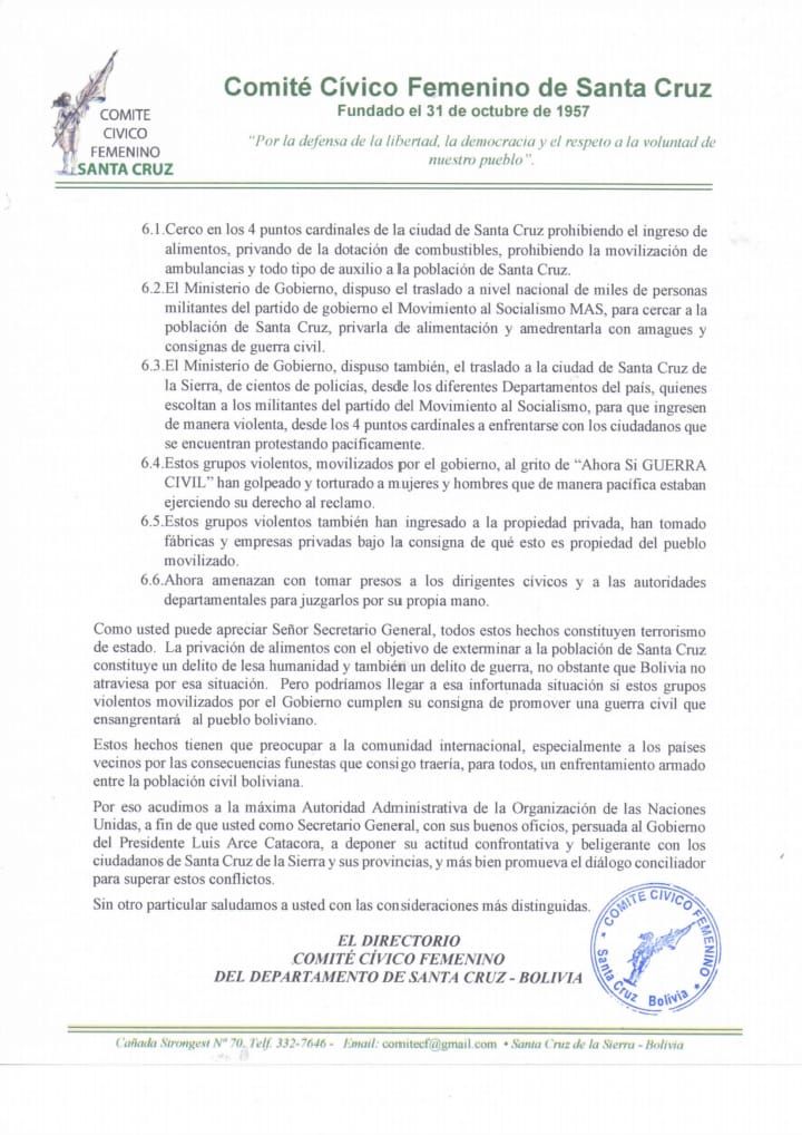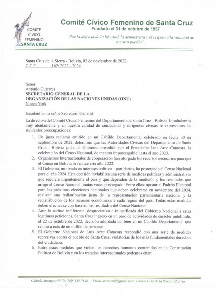 Comité Cívico Femenino de Santa Cruz denuncia ante la ONU «terrorismo de estado» y piden a su Secretario General, Antonio Guiteres, persuadir al Presidente Luis Arce a «deponer su actitud confrontativa y beligerante» con Santa Cruz y promover el diálogo conciliador.