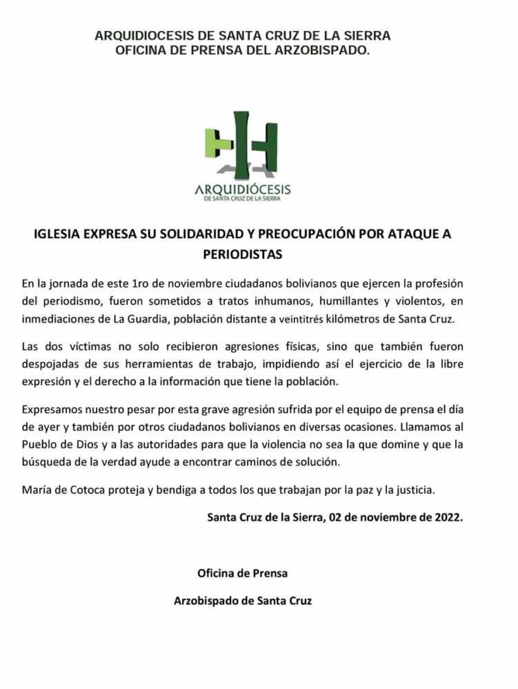🔵 #ANF | El Arzobispado de #SantaCruz de la Sierra expresa su preocupación por el ataque que sufrieron trabajadores de la prensa el 1 de noviembre durante los hechos de violencia en el municipio de La Guardia. pic.twitter.com/b4cgW2ZxyX