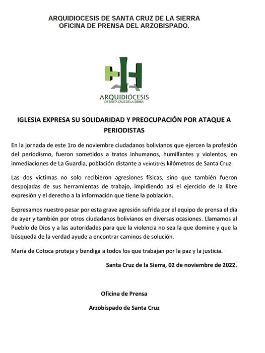 Iglesia expresa su solidaridad y preocupacion por ataque a periodistas en #SantaCruz