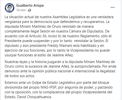 🔵#ANF I Diputado del MAS, Gualberto Arispe, denuncia a su colega Miriam Martínez de cometer un “golpe de Estado al Legislativo” tras reinstalar la sesión en la Cámara de Diputados y elegir una nueva directiva liderada por el diputado Jerges Mercado. pic.twitter.com/QlZ7GSqXFH