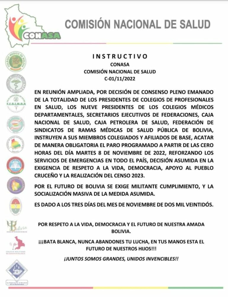 🔵 #ANF | La Comisión Nacional de Salud (Conasa) instruyó a sus afiliados acatar el paro convocado para el 8 de noviembre «en apoyo al pueblo cruceño y la realización del #censo 2023». https://t.co/TJlAtV1njB