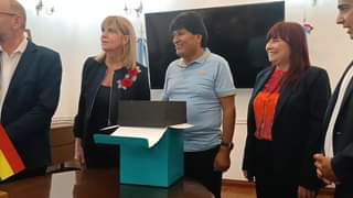 Vicegobernadora de la provincia de Santa Fe, Alejandra Rodenas, recibe con obsequios en la casa de la gobernación, al presidente nacional del MAS-IPSP, Evo Morales.