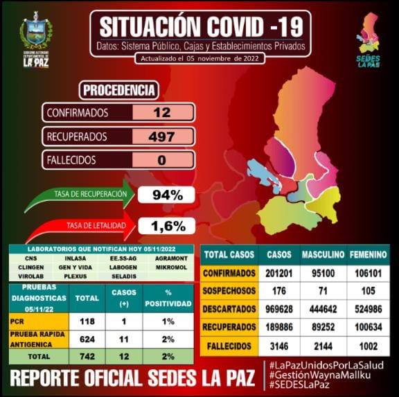 🔵#ANF | #Sociedad El Servicio Departamental de Salud de La Paz registró este sábado 12 casos positivos de #COVID19, ningún fallecido y 497 recuperados. https://t.co/YL0HmbToSk