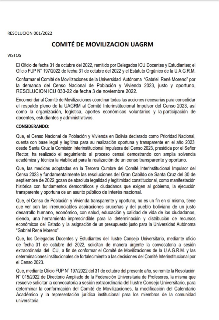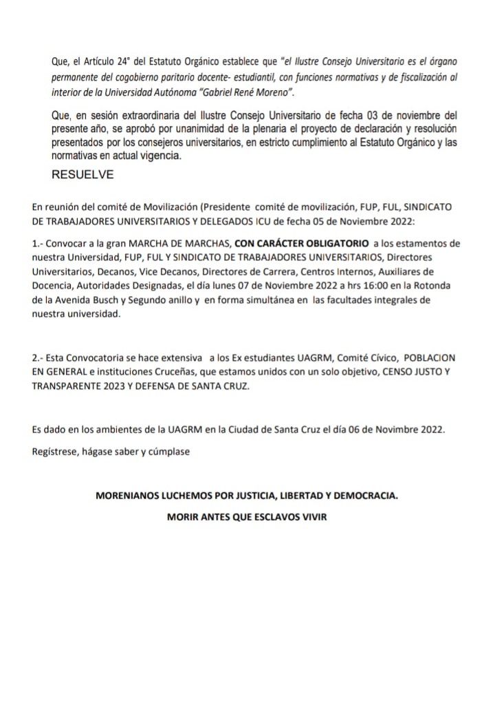 La #UAGRM convoca a la población a marchar este 7 de noviembre por un #Censo justo y en defensa de #SantaCruz