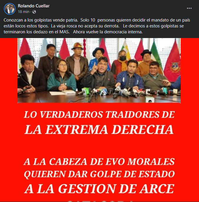 🔵 #ANF | El diputado Rolando Cuellar llama «golpistas vende patria» y «locos» a legisladores del MAS que cuestionan la elección de la nueva directiva en Diputados. «La vieja rosca no acepta su derrota. Le decimos a estos golpistas se terminaron los dedazos», publicó en Facebook. https://t.co/tfz9NC9afQ