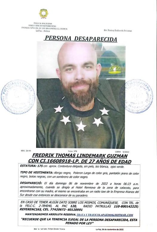 Fredrik Guzmán, entró en un taxi a las 06.23 AM, hora local de Bolivia, el domingo 6 de noviembre, en La Paz y pidió ir al Hotel Rennova en Calacoto, La Paz, pero nunca llegó.