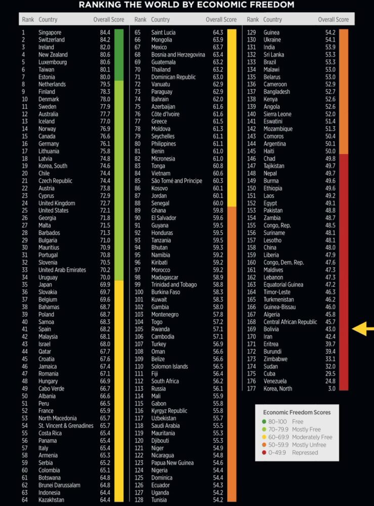 Recordatorio de cómo en Bolivia #estamossaliendoadelante: A diferencia de 2021, cuando ocupó el puesto 172 del Índice de Libertad Económica de @Heritage y WSJ, en 2022 Bolivia alcanzó mayor libertad económica que Irán, ocupando el 169 (otros cayeron más o no fueron analizados). https://t.co/9UVCC9EdDO