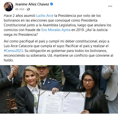«Así como pacifiqué el país y cumplí mi deber constitucional, exijo a Luis Arce Catacora que cumpla el suyo: Pacificar el país y realizar el #Censo2023. Su obligación es gobernar para todos los bolivianos, reconociendo su soberanía. Usted mantiene un conflicto que conviene al huído», dijo la expresidenta Jeanine Añez.