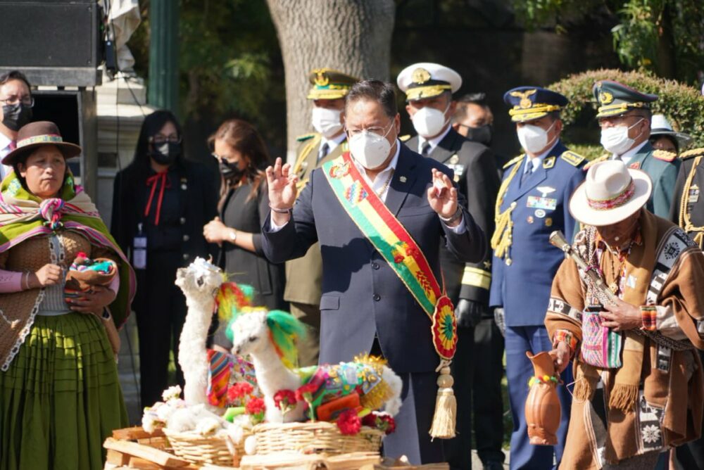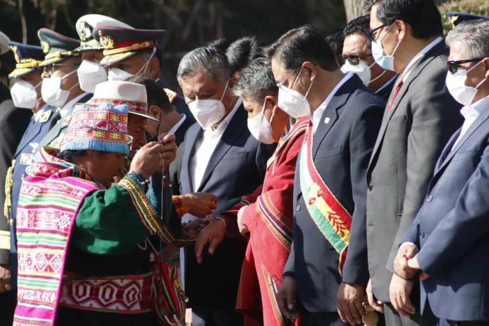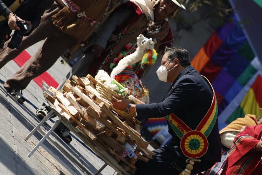🔵 #ANF | El presidente Luis Arce, el vicepresidente David Choquehuanca y otras autoridades participan de un ritual de agradecimiento a la Madre Tierra en la plaza Murillo, como parte de las actividades conmemorativas por los dos años de gestión del mandatario. (📷MinPres) pic.twitter.com/weNxhSXEWQ