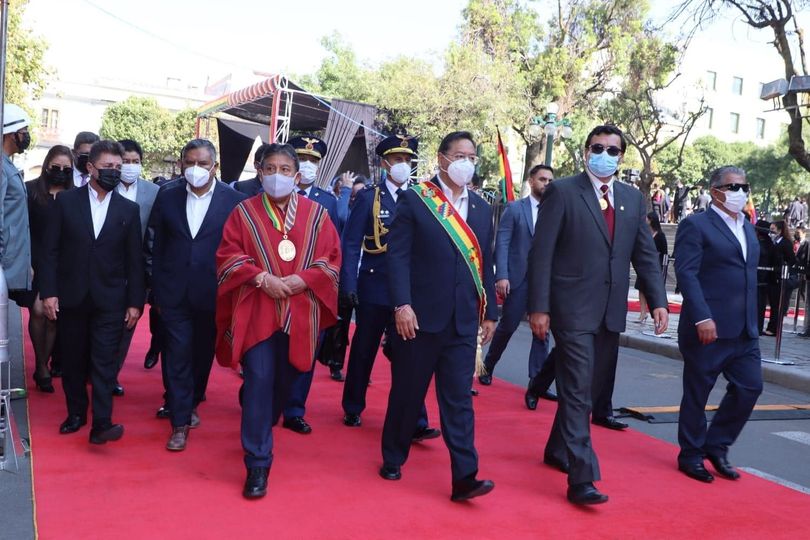 El Presidente Luis Arce participó del ritual ancestral como parte del inicio de los actos protocolares por su segundo año de gestión. En la imagen Arce aparece junto al Vicepresidente, David Choquehuanca, el nuevo Presidente del Cámara de Diputados, Jerjes Mercado y el Ministro de defensa, Edmundo Novillo en primera línea.