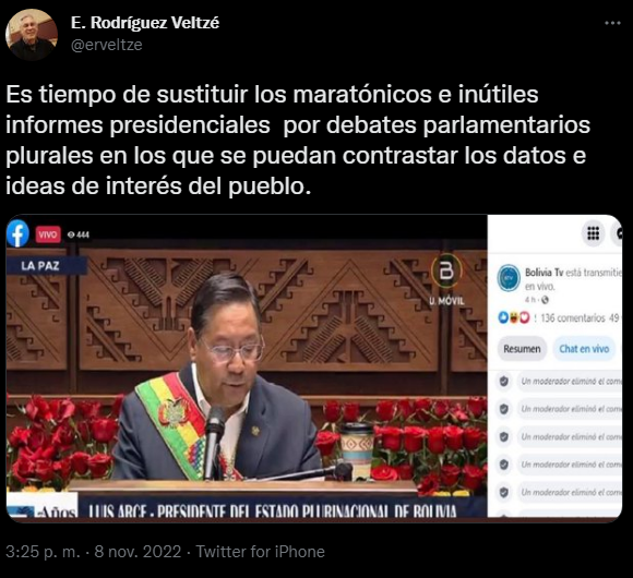 🔵#ANF I Tras el informe de gestión del presidente @LuchoXBolivia , el exmandatario @erveltze afirma que «es tiempo de sustituir los maratónico e inútiles informes presidenciales» por «debates parlamentarios plurales». https://t.co/xySTSiqnYA