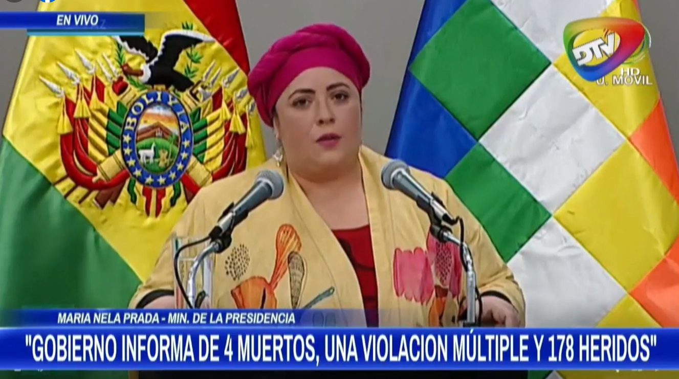 La ministra de la Presidencia, María Nela Prada, afirma que “el paro cívico ha generado muerte, dolor y pobreza».