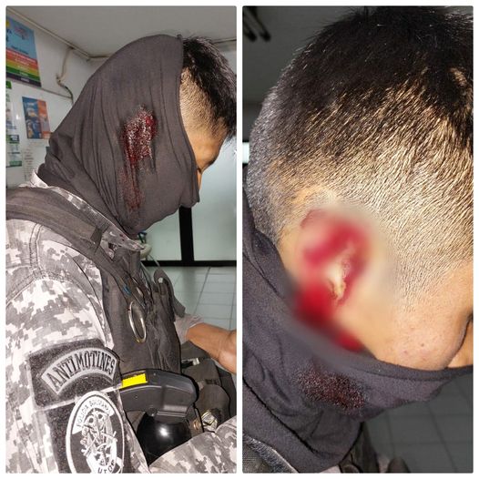 #SantaCruz: Un policía de la UTOP resultó herido al recibir un piedrazo en la cabeza de parte de vecinos que mantienen un punto de bloqueo en la av. Tres Pasos al Frente. 📸 Redes Sociales