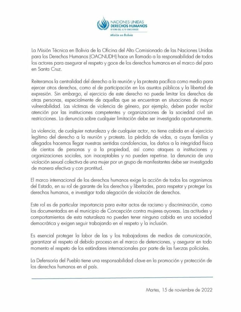 🔵 #ANF | Ante los hechos de violencia en #SantaCruz, la @Oacnudh_BO exige la acción de los organismos de Estado, como la Defensoría del Pueblo, para garantizar y proteger los derechos humanos e investigar cualquier denuncia de violación de derechos. pic.twitter.com/9wZFXsdaWF