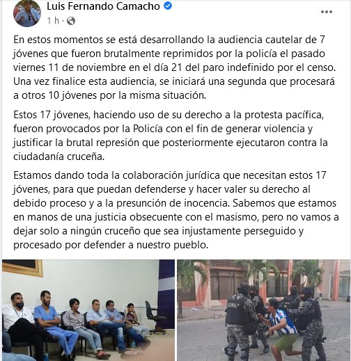 «Sabemos que estamos en manos de una justicia obsecuente con el masismo, pero no vamos a dejar solo a ningún cruceño que sea injustamente perseguido y procesado por defender a nuestro pueblo», dijo el Gobernador de Santa Cruz, Luis Fernando Camacho.