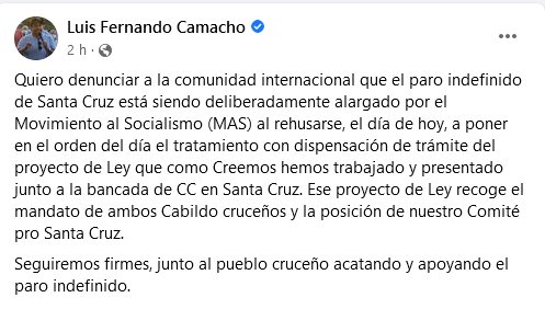 «Quiero denunciar a la comunidad internacional que el paro indefinido de Santa Cruz está siendo deliberadamente alargado por el Movimiento al Socialismo (MAS)”, escribió en sus cuentas de redes sociales el Gobernador de Santa Cruz, Luis Fernando Camacho.