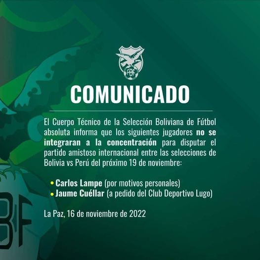 Cuellar y Lampe no formarán parte de la selección para el amistoso frente a PerúCategorías NoticiasEtiquetas , Facebook, Gigavisión 16/11/2022 #Comunicado fbf => Recibir por Whatsapp las noticias destacadas [vid_embed] Fuente: Gigavisión