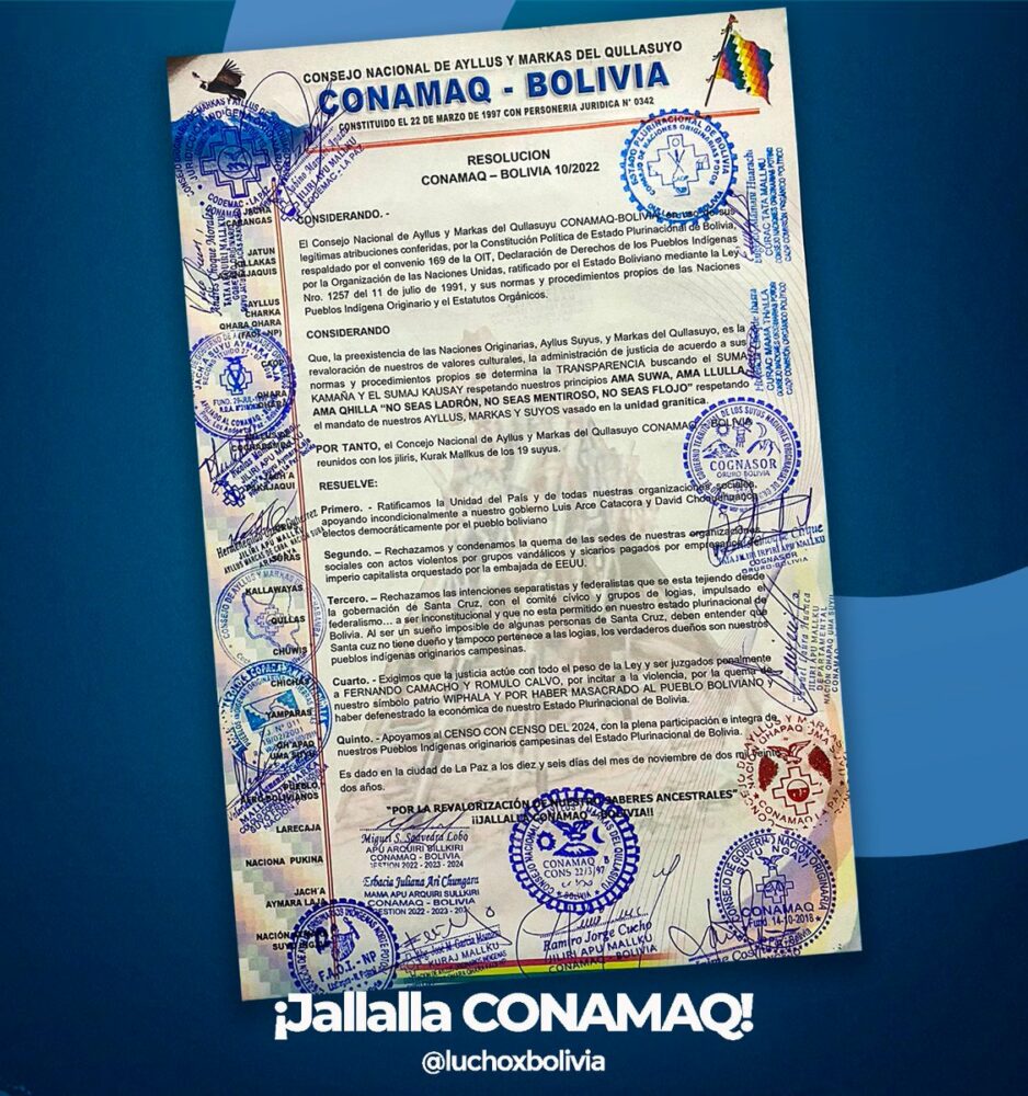 La sabiduría del Consejo Nacional de Ayllus y Markas del Qullasuyo – Conamaq, siempre será un gran aporte y fortaleza de nuestra Revolución Democrática y Cultural. Muchas gracias por ese permanente respaldo.