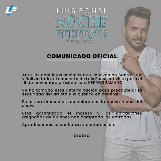 Paro cívico en Santa Cruz obliga a reprogramar conciertoCategorías NoticiasEtiquetas , Detrás de la Verdad, DTV, Facebook 16/11/2022 [vid_embed] Fuente: DTV => Recibir por Whatsapp las noticias destacadas