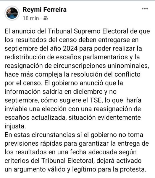 Asimismo, mediante su cuenta de facebook, agregó que si «el Gobierno» no toma acciones rápidas conforme a los criterios del TSE, «dejará activado un argumento válido y legítimo para la protesta».