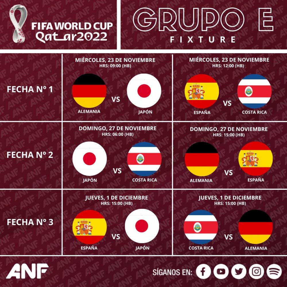 ⚽️ #ANF | #Deportes #MundialCatar2022 : revise el fixture del Grupo E. El máximo evento del #futbol mundial se inaugura el próximo 20 de noviembre. https://t.co/4lSIFcUrkb