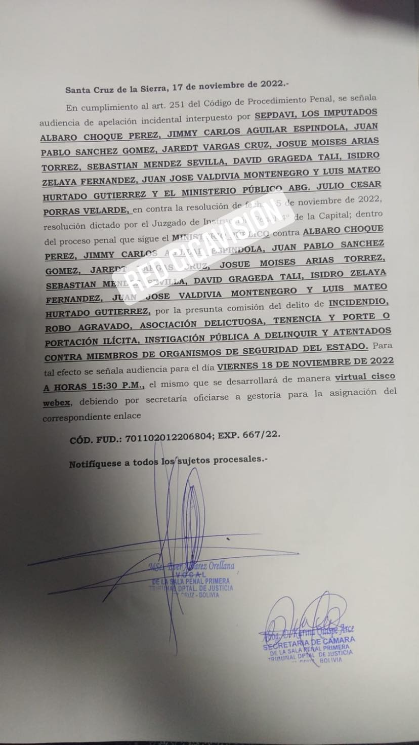 Justicia fija en tiempo récord fecha y hora de apelación a libertad de 10 detenidos que fueron detenidos por estar presuntamente implicados en la quema y robó de la sede de la Central de Campesinos, el recurso fue planteado por el Ministerio de Justicia y Fiscalía y será atendido por la Sala Penal Primera a cargo del Vocal, Evert Álvarez. La libertad de un bombero voluntario, un fotoperiodista, un mototaxista, un chalequero y otros podría ser revocada este viernes en audiencia fijada a las 15:30.