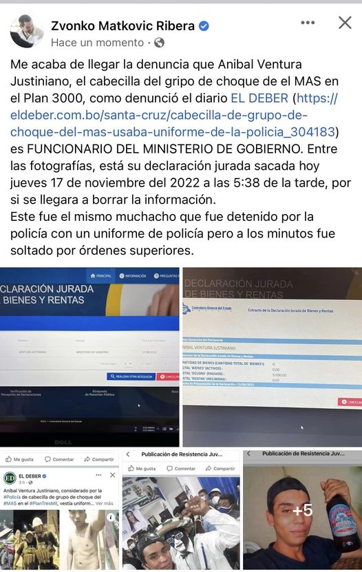 El Presidente de la Asamblea Legislativa de Santa Cruz, Zvonko Matkovic, a través de sus redes sociales denuncia que Aníbal Ventura supuesto cabecilla del grupo de choque en el Plan 3000 (segun registro de la Contraloría) sería funcionario del Ministerio de Gobierno.