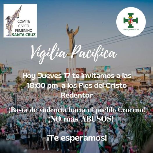 #SCZ:Comité Cívico Femenino invita a todas las mujeres a la VIGILIA PACIFICA, hoy desde el Cristo hasta el Comando de Policía
