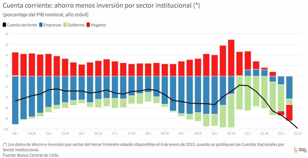 #Chile | El déficit en cuenta corriente se dispara al 9,9% del PIB en el tercer trimestre. Cada vez menos ahorro nacional, menor inversión internacional y más deuda externa. Qué rápido empobrece la extrema izquierda a un país que solía ser un gran ejemplo del camino a seguir. https://t.co/jD4cRGgu93