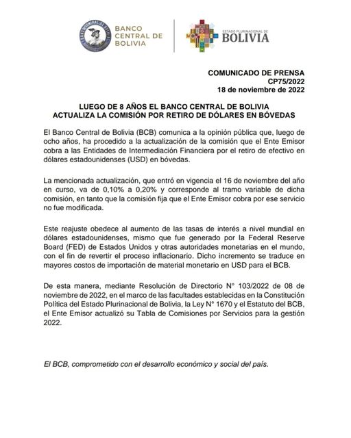 COMUNICADO: El BCB Ajusta el cobro de comisión a entidades financieras por retiro de dólares en bóvedas.