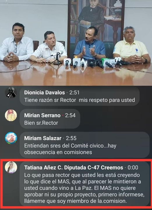 Salen a flotes las diferencias entre la diputada de Creemos, Tatiana Áñez, quien en una transmisión en vivo de la conferencia del Rector, Vicente Cuellar, le pidió que se informe primero antes de hablar de los proyectos de ley que están siendo tratando en la comisión de constitución de diputados respecto al Censo.