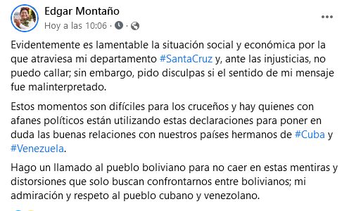 “Tanto criticaban de Venezuela y Cuba, en estos momentos, mi departamento, Santa Cruz de la Sierra, está peor que eso. Es más, en cada rotonda, en cada bloqueo cobran 5, 10, 20 bolivianos”, señaló Montaño.